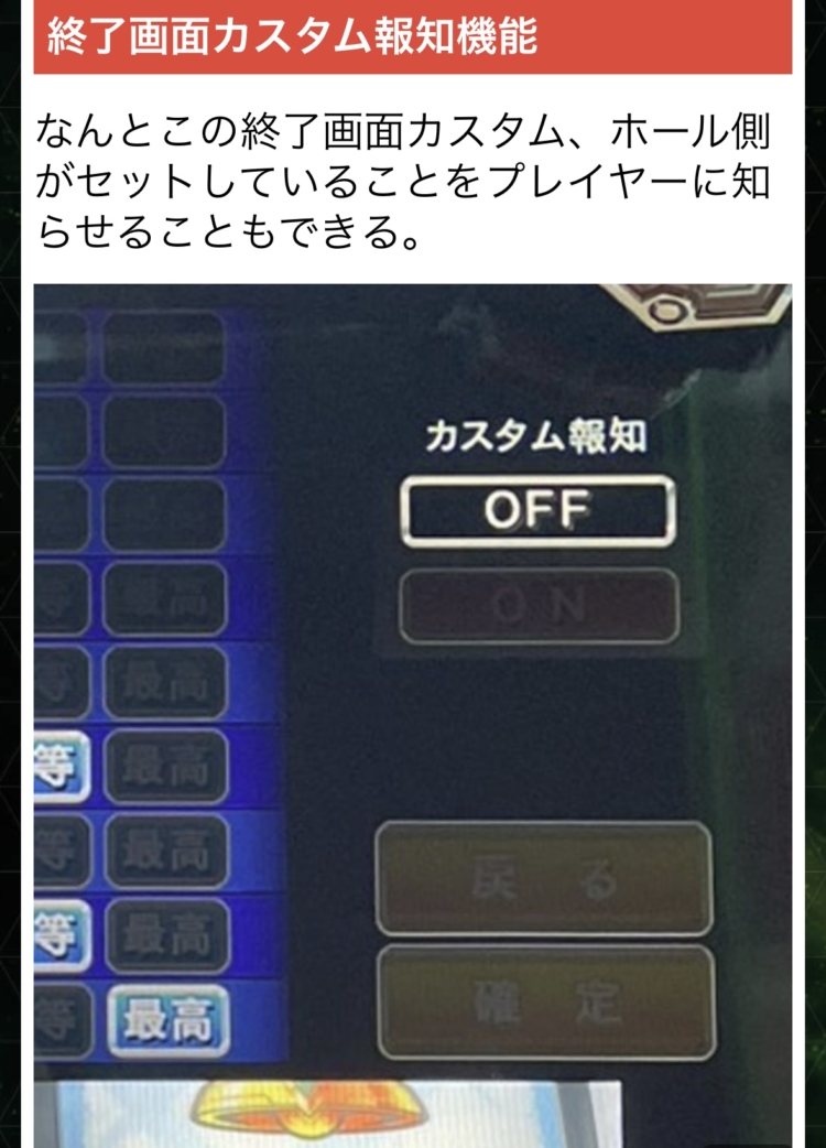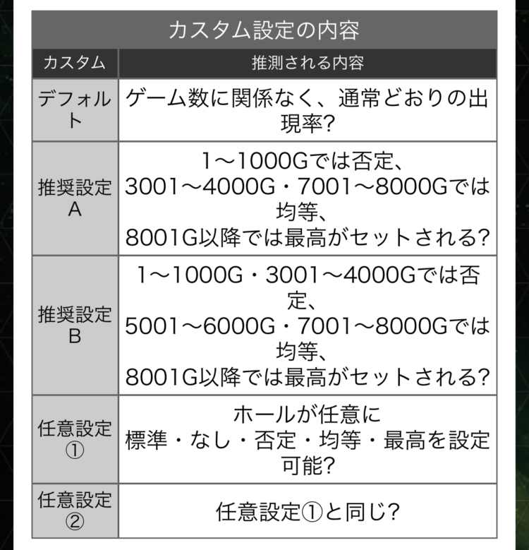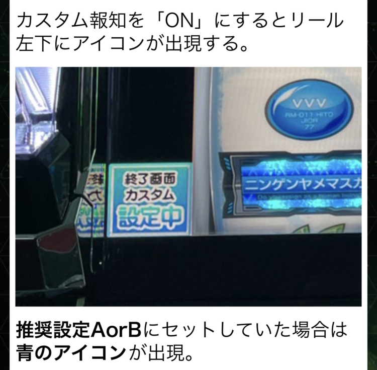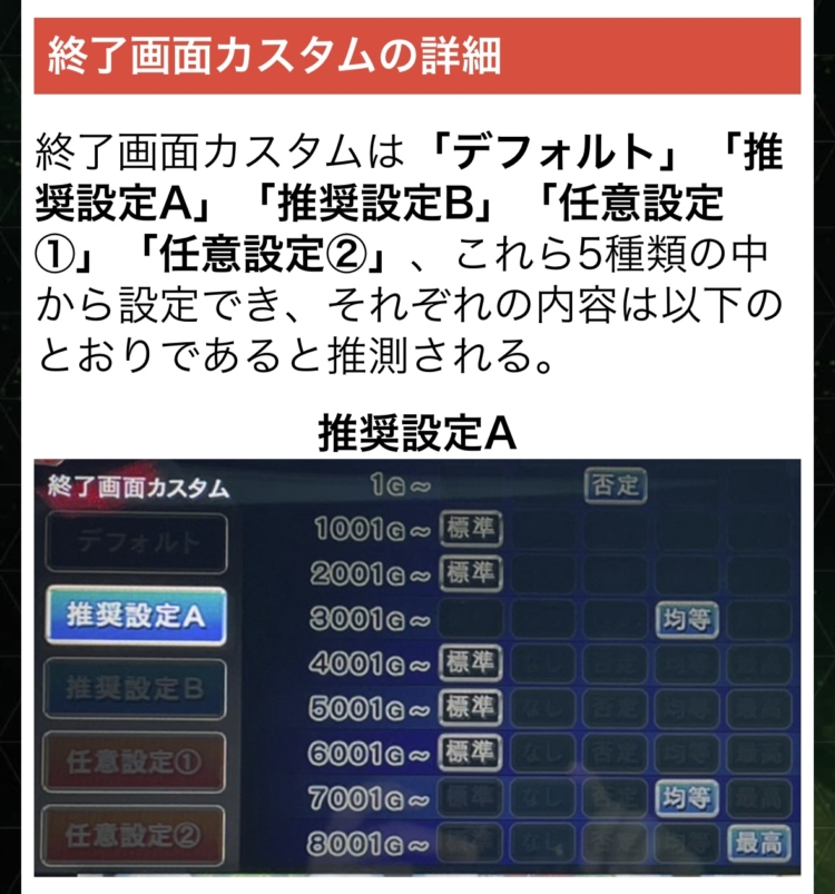 『終了画面カスタム設定中(青)』が出現している台は朝イチ否定系が出て、8001G消化後は答え合わせができるとしっかり覚えておきましょう!