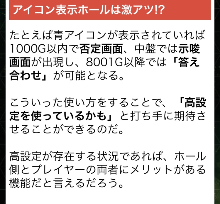 つまり青アイコンは、打つ前から朝イチは必ず否定系の画面が出現し、8001G消化後は必ず最高の示唆画面が出現するカスタムが設定されていることがわかってしまう。