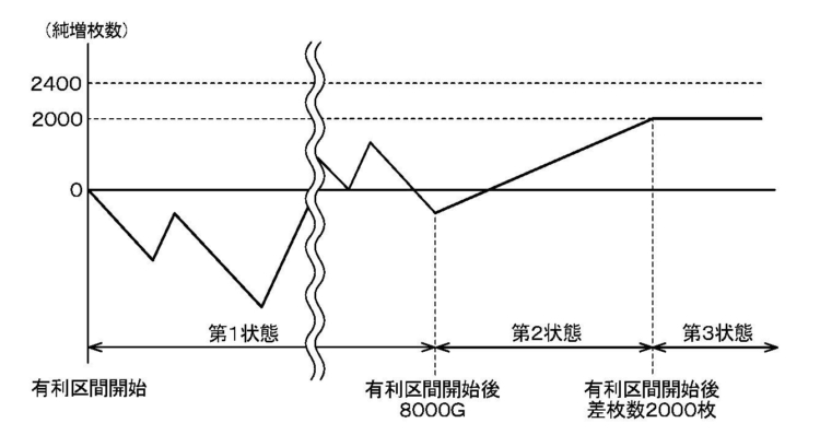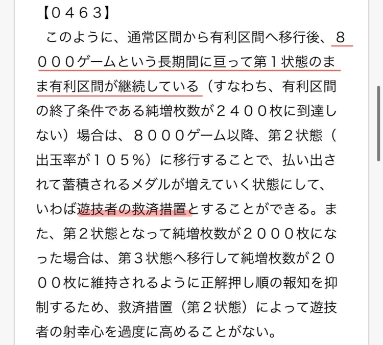 有利区間が8000G以上継続すると出玉率105%になるが+2000枚を超えると有利区間が切れないようにナビ確率が抑制される仕様の特許が発見される・・・