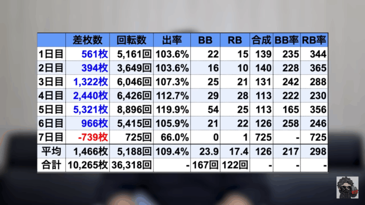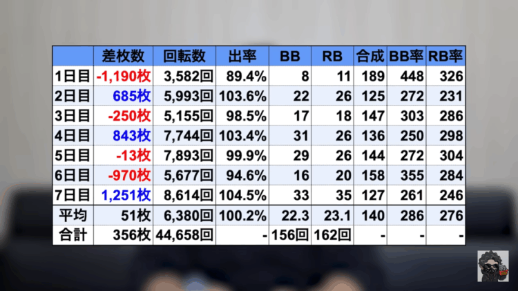 このデータを見て「1週間据え置いたらこうなるんだ!」となるのはもちろんなんですが、7台設置の全4・全5データとして見るとより実戦に役立ちますね!回転数は若干少なめだけどw