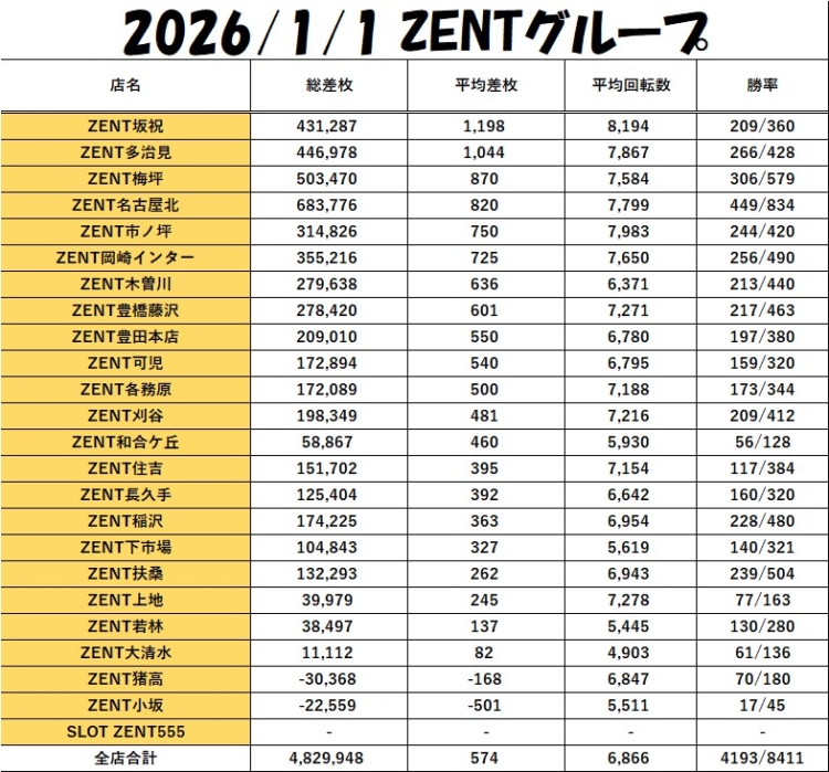 【総差枚数+480万枚】ZENTグループ、2026年1月1日も約9600万円の赤字営業で優勝してしまうwww