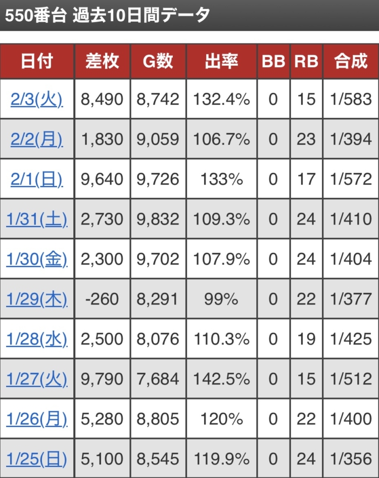 ベガスベガス大東店(大阪)にあるグランドオープンから毎日設定6濃厚の『LモンキーターンV』(禁煙台モンキー)のデータがこちらです。