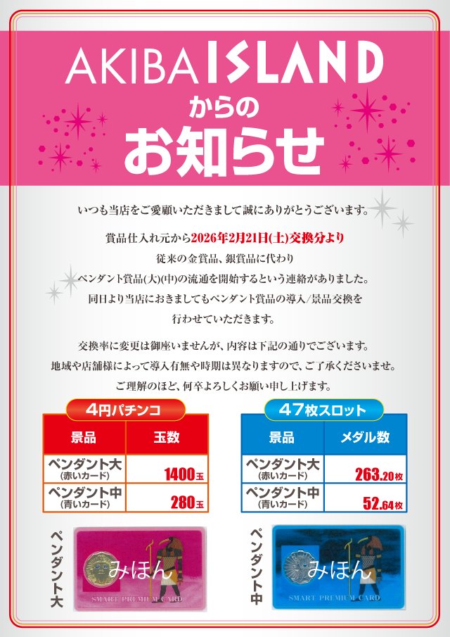【金景品終了?】アイランド秋葉原店、本日2/21より金・銀賞品の取扱を終了しペンダント賞品に移行する模様