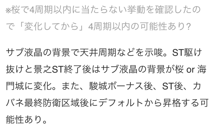開始から4周期抜けた報告がいくつか挙がっているので、桜に変化した周期から4周期以内でのエピボ当選を示唆してる可能性が高そうですね。