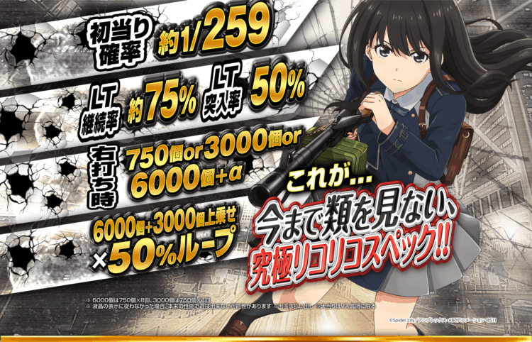 2026年4月6日導入予定 ニューギンの新台スマパチ『eリコリス・リコイル』スペック情報・機種サイト等が公開されました。