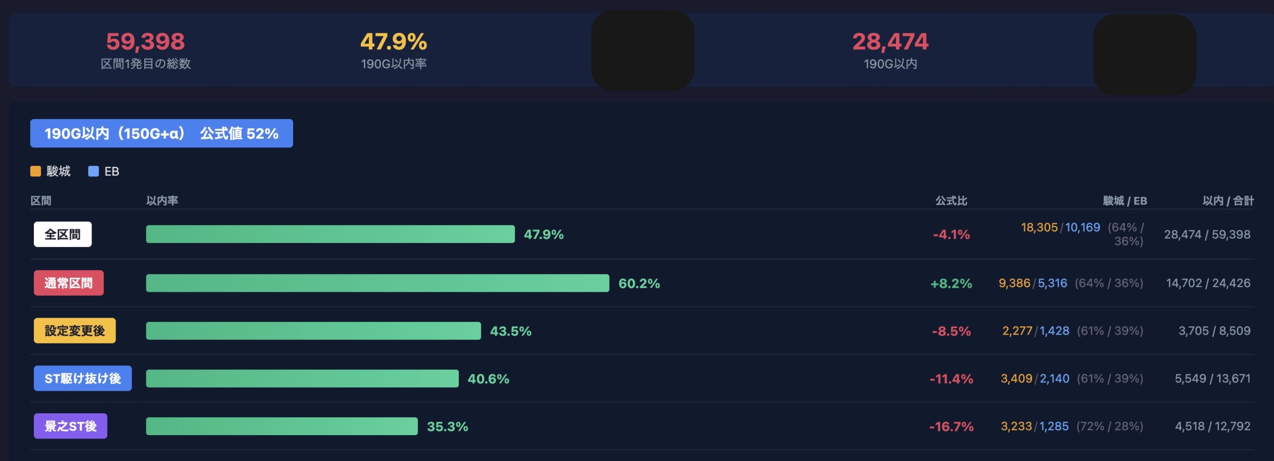 ➡️ 全合算:47.9%⚠️ 景之ST後の罠150G以内の当選率が低いだけでなく、当たった際の「駿城ボーナス割合」も71.6%と極めて高い!